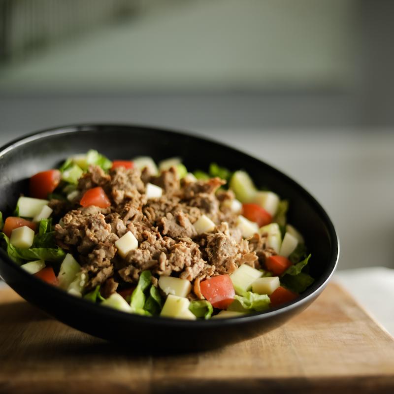 Ribeye shaved steak on top of garden salad.