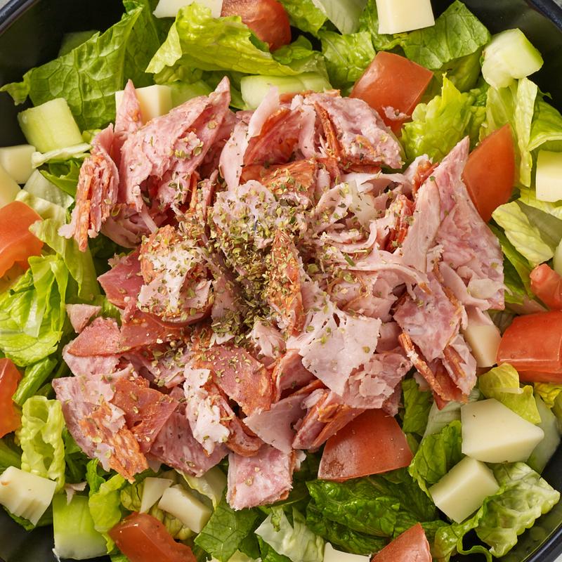 Ham, genoa salami, spicy capicola, pepperoni, and oregano on top of garden salad.