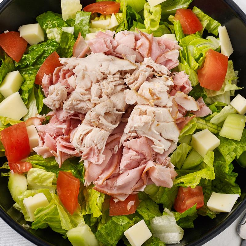 Chopped turkey and ham on top of garden salad.